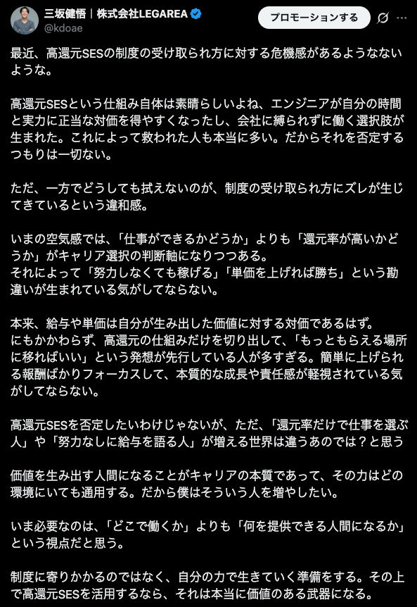 ここ数年、高還元SESという仕組みが急速に広まる中で、僕が特に懸念しているのは還元率を基準に転職先を決めることが当たり前になっているという空気です。